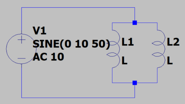 For the example mentioned above, we want to define 2 coils connected in parallel. We apply 10V voltage to the voltage source with 50 Hz frequency. We position each component between the 2 nodes that are present, and define placeholder L values for both our inductors.