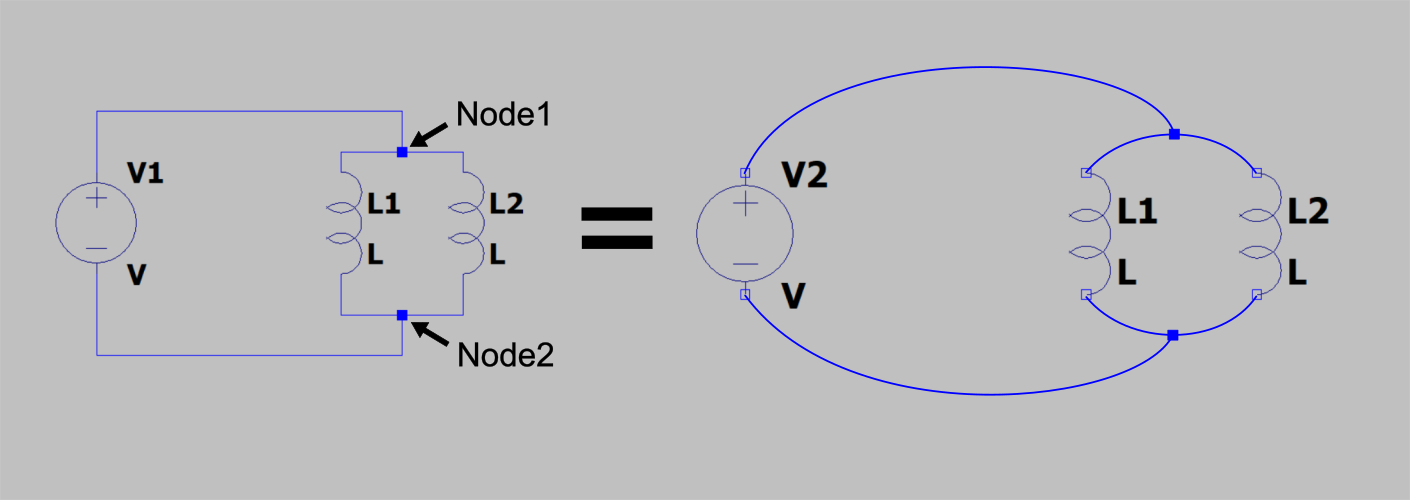 Node1 and node2 again can be defined freely. For example, you can assign a number (0, 1, 2 and so on), a letter (a, b, c and so on) or some more elaborate names, such as N001, N002 and so on. Nodes are intersection points between every 2 components in your system. Note that nodes are not corners where the same wire turns! For example, in this schematic there are only 2 nodes that connect everything together, despite the fact that visually wires are bent at different places as well.