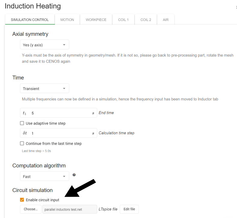 CENOS Induction Heating allows you to apply current, voltage or power values directly to your inductors. However, sometimes you do not know the specific values on the inductor, but you do have a circuit where the coil is present, and its information. You can use this circuit information do define a netlist file that will govern the applied current and voltage values on your inductors.