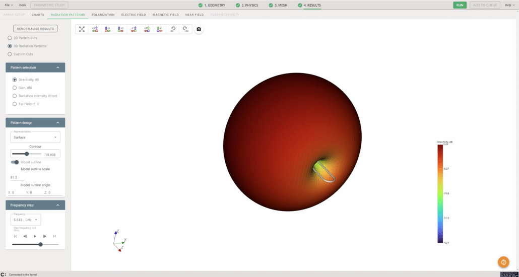 When calculation is done, results will automatically open in Results tab. Congratulations, you have successfully finished a wire antenna simulation!