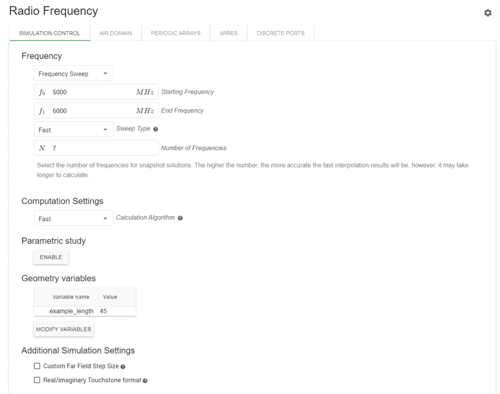 In SIMULATION CONTROL you define either a single frequency or a frequency sweep. You can choose a fast or discrete frequency sweep.
