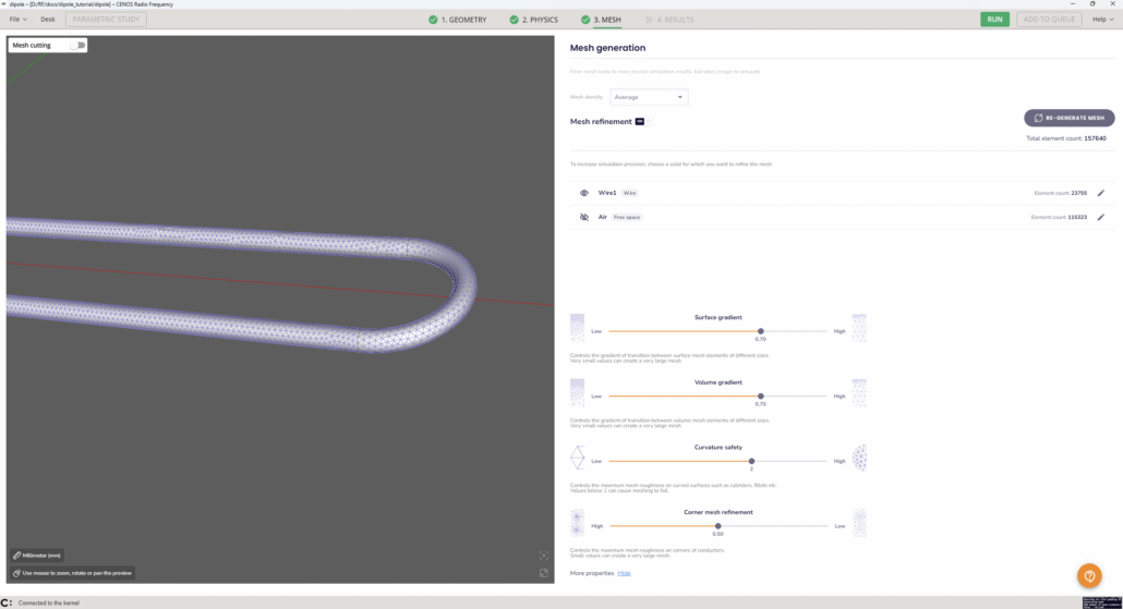 If during the calculation you get a message about meshing problems, you will need to manually mesh your antenna. You can also mesh it manually already in the mesh generation section in case you want more control over your simulation.