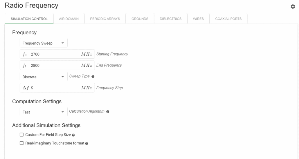 In SIMULATION CONTROL you define either a single frequency or a frequency sweep. You can choose between fast and discrete frequency sweep.