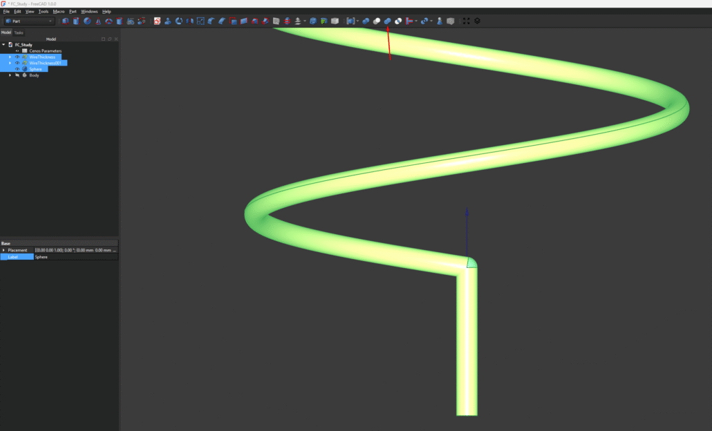 In order to completely unite the helix with the inner conductor of the coaxial cable, we will place a sphere, which can be found in the toolbar of the Part workbench. Do not forget to set the radius of the sphere to the same dimensions as the radius of the antenna wire.