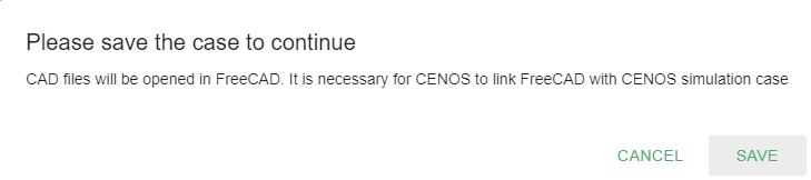 At this point you need to save the case, otherwise if you try to open FreeCAD, CENOS will not let you move forward.