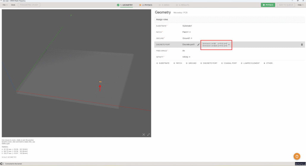 Finally we need to define the port. We will be using a discrete port so it is necessary to select two terminals, one on each conductive surface where you connect the feed in real life.