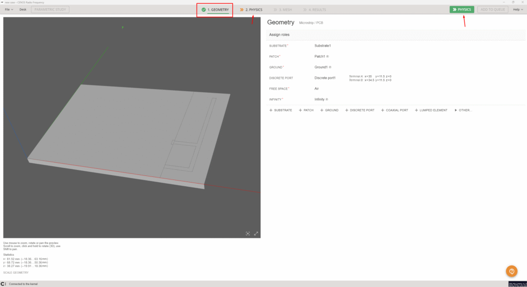 Once all physical parameters are filled, it will be possible to move on to the meshing stage. You will notice that there are no more unfilled parameters once you see the Physics tab in green.