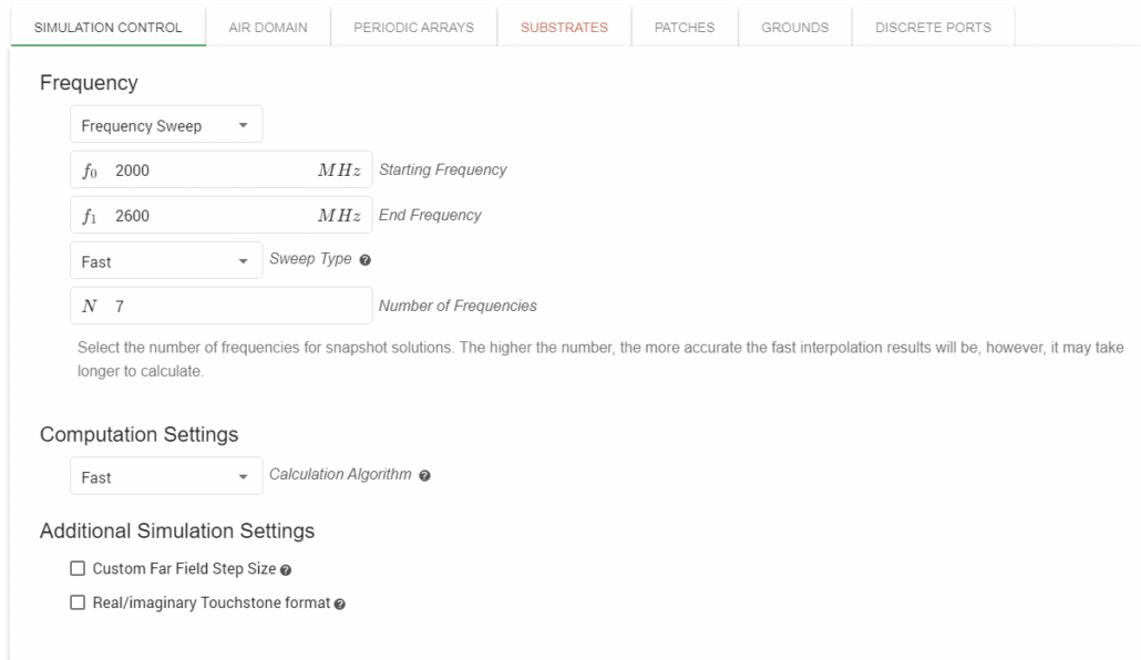 We will do a frequency sweep, for which we select the start frequency and end frequency in the SIMULATION CONTROL section. Set the start frequency as 2000 MHz, and end frequency as 2600 MHz. Leave everything else as it is by default.