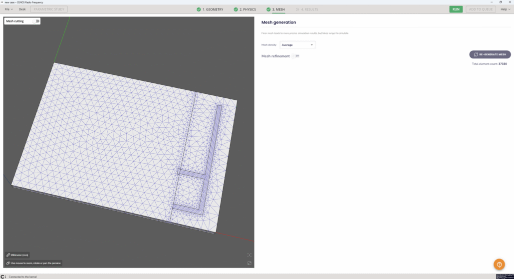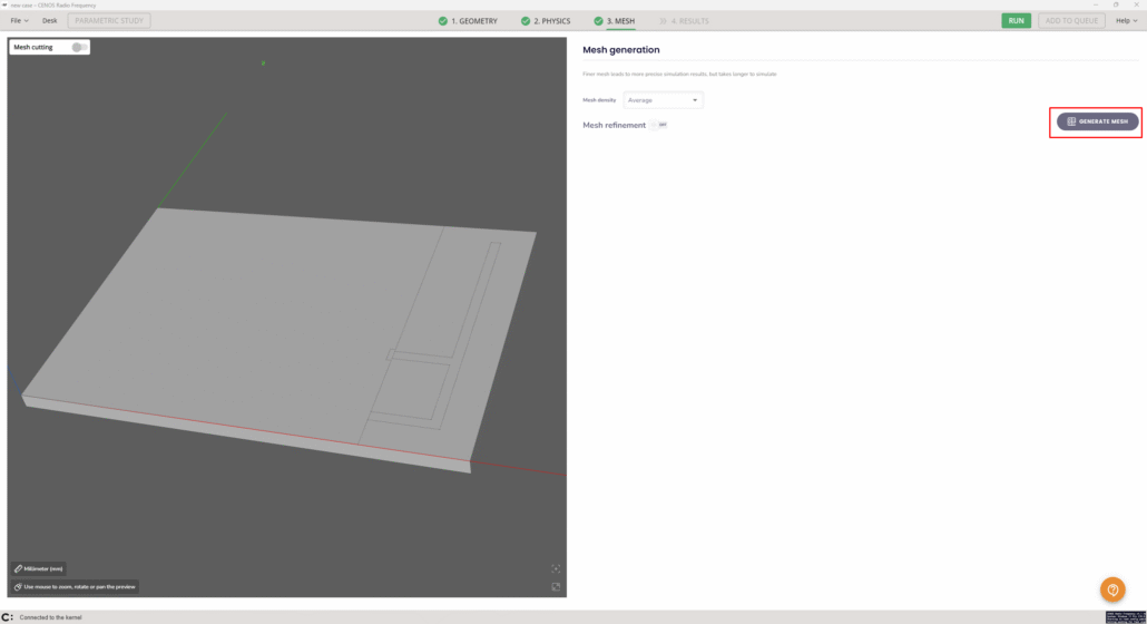 Once all physical parameters are filled, we need to create the mesh. CENOS gives you the possibility to create a mesh automatically, all we need to do is click on GENERATE MESH.