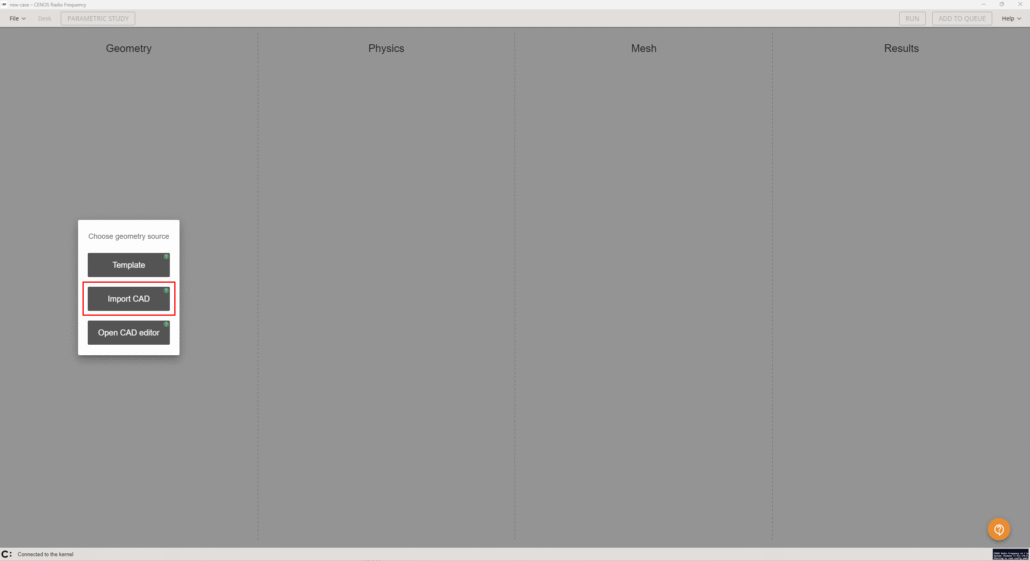 First we need to select the method with which we will load our geometry, in this case we will use the Import CAD approach.