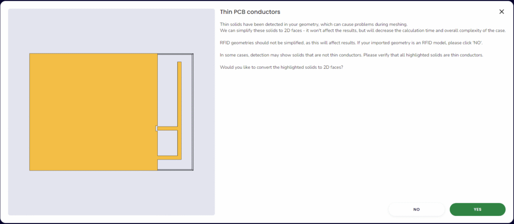 In case you are working with very thin conductors (<50um) these will be detected by the software and you will have the option to flatten them to work with 2D faces or you can continue without modifying the original geometry at all.