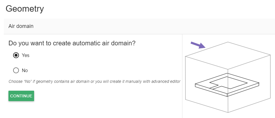 Once the CAD files are uploaded, CENOS will ask if you want to automatically generate the air box (ambient environment around your system). If your CAD model does not include the air box click Yes on the choice, and then CONTINUE.