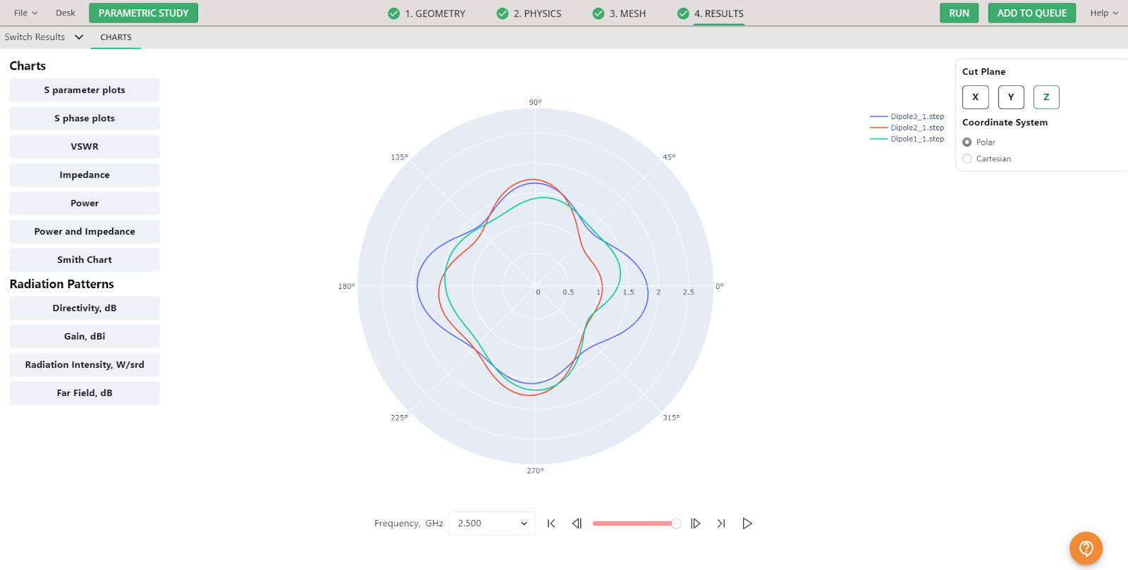 Similarly, the radiation patterns for all cases can be viewed in 2D, in both polar and cartesian coordinate systems, for each calculated frequency. This setup provides a clear and convenient way to analyze and evaluate the performance of each configuration.