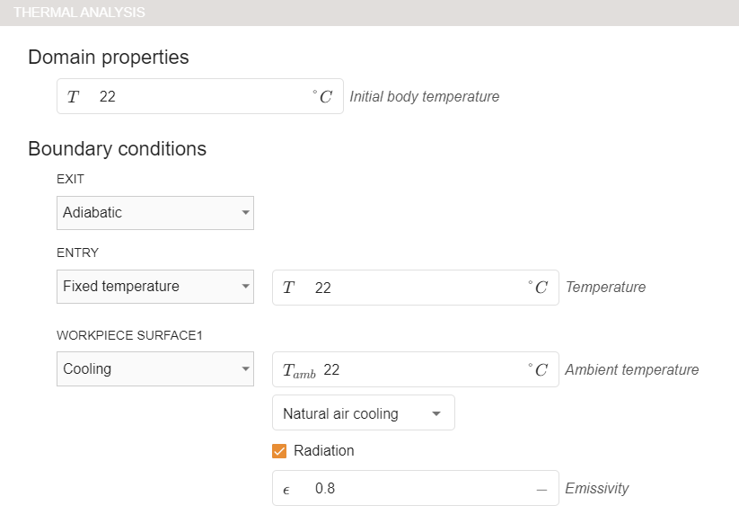 Under THERMAL ANALYSIS you need to modify the Boundary conditions. Here for the EXIT side, we need to assign Adiabatic, for the ENTRY assign Fixed temperature of 22 degrees and leave Workpiece surface 1 as is.
