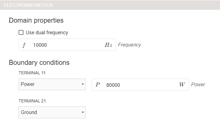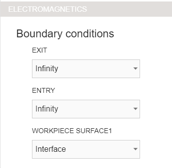 Under ELECTROMAGNETICS you will see that the symmetry boundary conditions also need to be modified. Since ENTRY and EXIT are quite far from the inductor, they will not be influenced by the magnetic field, so we can assign Infinity to both of them.