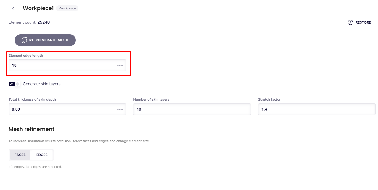 Next, go to the WORKPIECE tab. There you will need to change the element edge length from the default value to 10.
