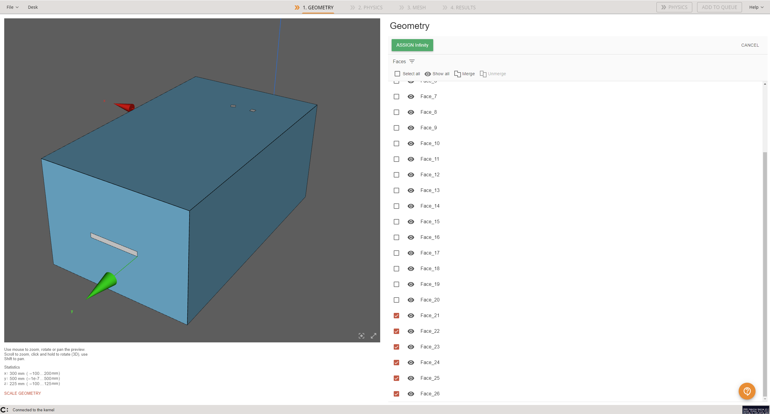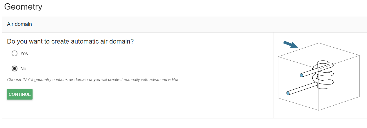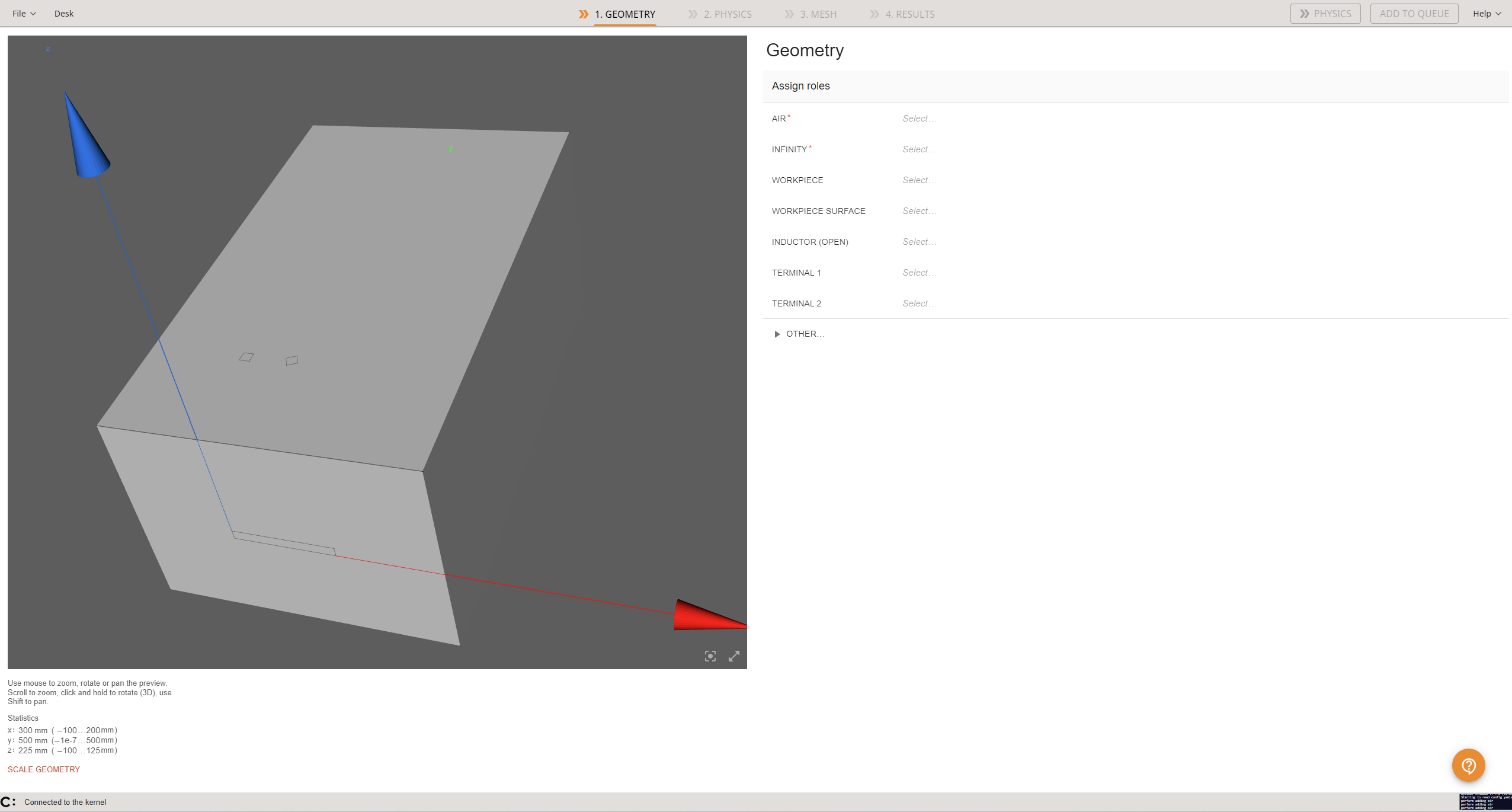 You will be redirected to the Physics window, where physical definitions are present. On the left you can see the preview window of your geometry, but on the right – the actual physical definitions. You can navigate physics through the domain tabs above the physical definitions.