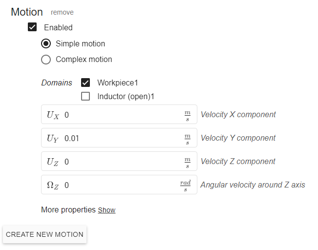 Input 0.01 m/s as the motion speed for the Y direction – this will make sure that the thermal field motion is from ENTRY to EXIT as specified previously.