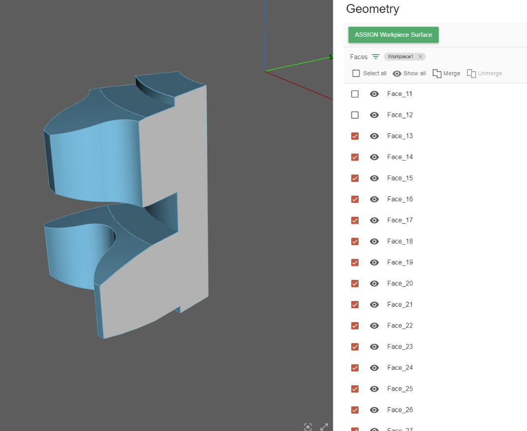 You can see that two faces have not been selected (you can see one of the faces in the preview window). After this, click ASSIGN Workpiece Surface.