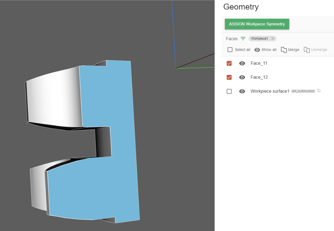 In the selection menu select the two faces and click ASSIGN Workpiece Symmetry.