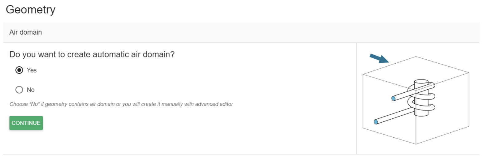 Once the CAD files are uploaded, CENOS will ask if you want to automatically generate the air box (ambient environment around your system). Click Yes on the choice, and then CONTINUE.