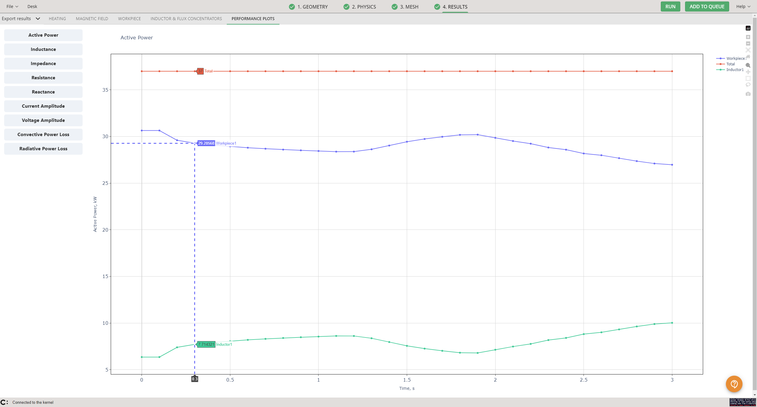 In results, sliced cases have one exception to usual results – in the performance plots tab you will see that the active power has been calculated to represent the total power for the whole system – as mentioned before, the full system would have 37 000 watts.