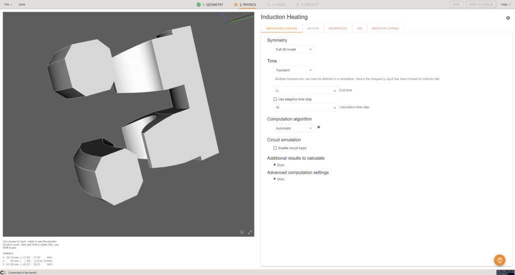 You will be redirected to the Physics window, where physical definitions are present. On the left you can see the preview window of your geometry, but on the right – the actual physical definitions. You can navigate physics through the domain tabs above the physical definitions.