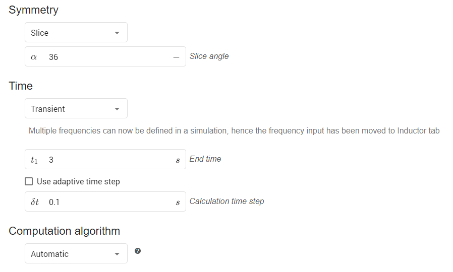 In the SIMULATION CONTROL window define the simulation as a slice of 36 degrees, transient, 3 s End time and 0.1 s time step. For Computation algorithm leave Automatic.