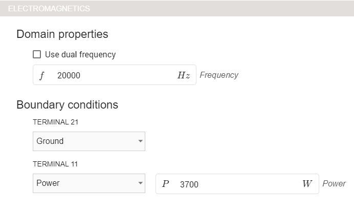 Under ELECTROMAGNETICS input 20 kHz frequency, choose Power for TERMINAL11, Ground for TERMINAL21.