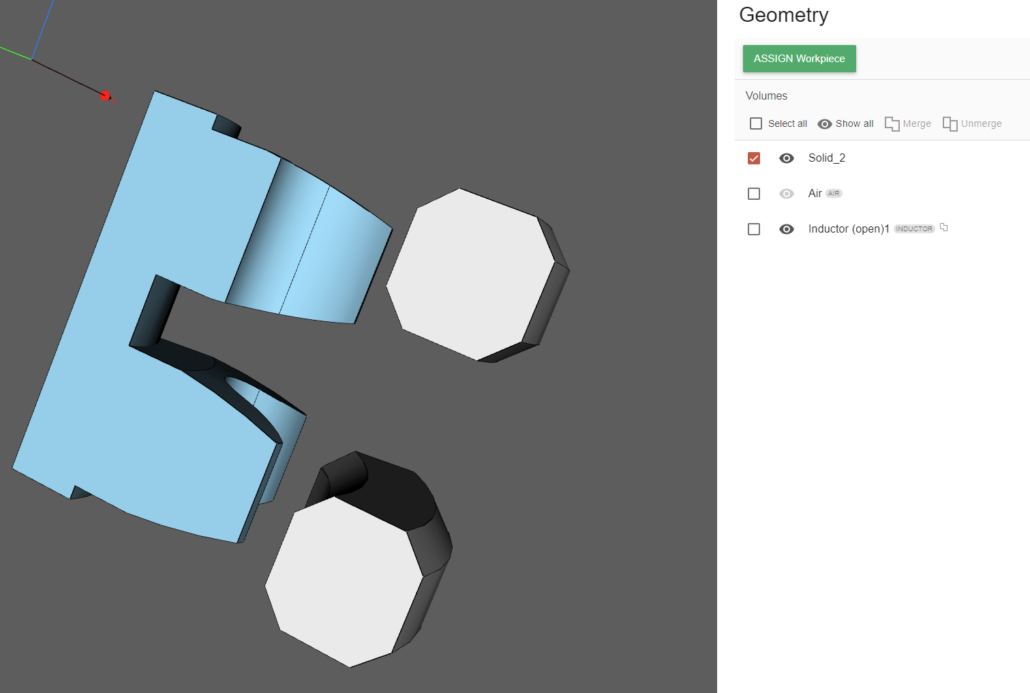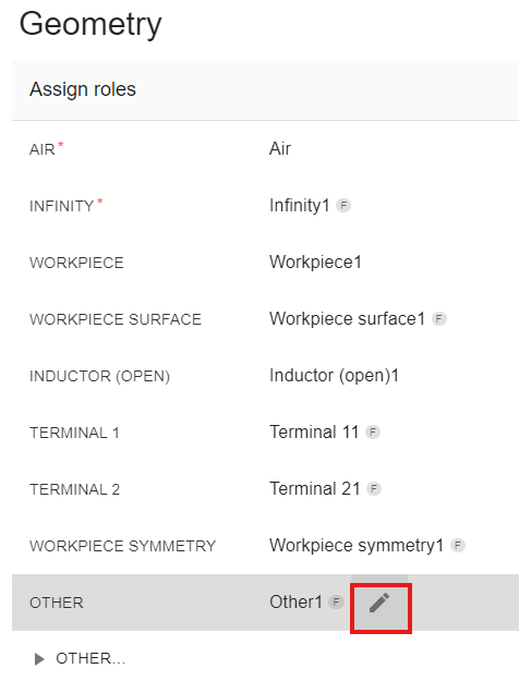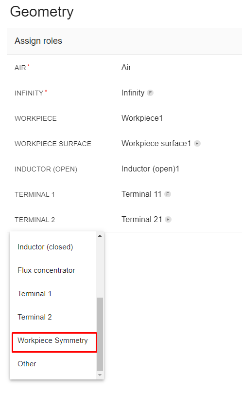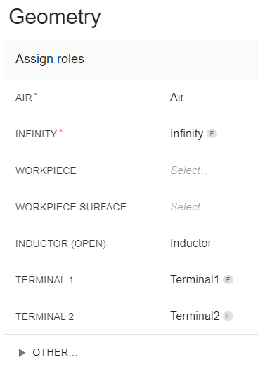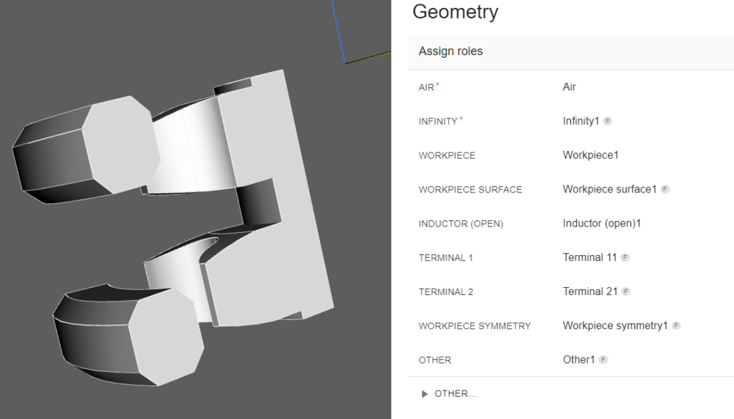 You will see that the selected inductor and its terminals have already been assigned automatically, so we need to assign roles to the other inductor and its terminals as well as to the workpiece and its surface.