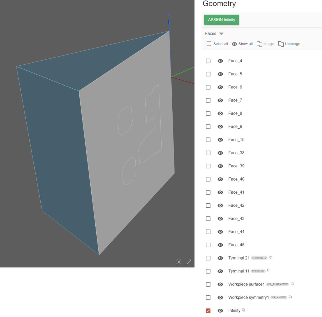 You can filter the faces by the workpiece and click Select All to ease the process. However, note that since this is a slice case – so it is only a fragment of a full 3D geometry – the workpiece surface does not include the two faces that are on the cut planes. We need to deselect those faces, which we can do by holding shift and clicking on the two faces in the geometry preview.