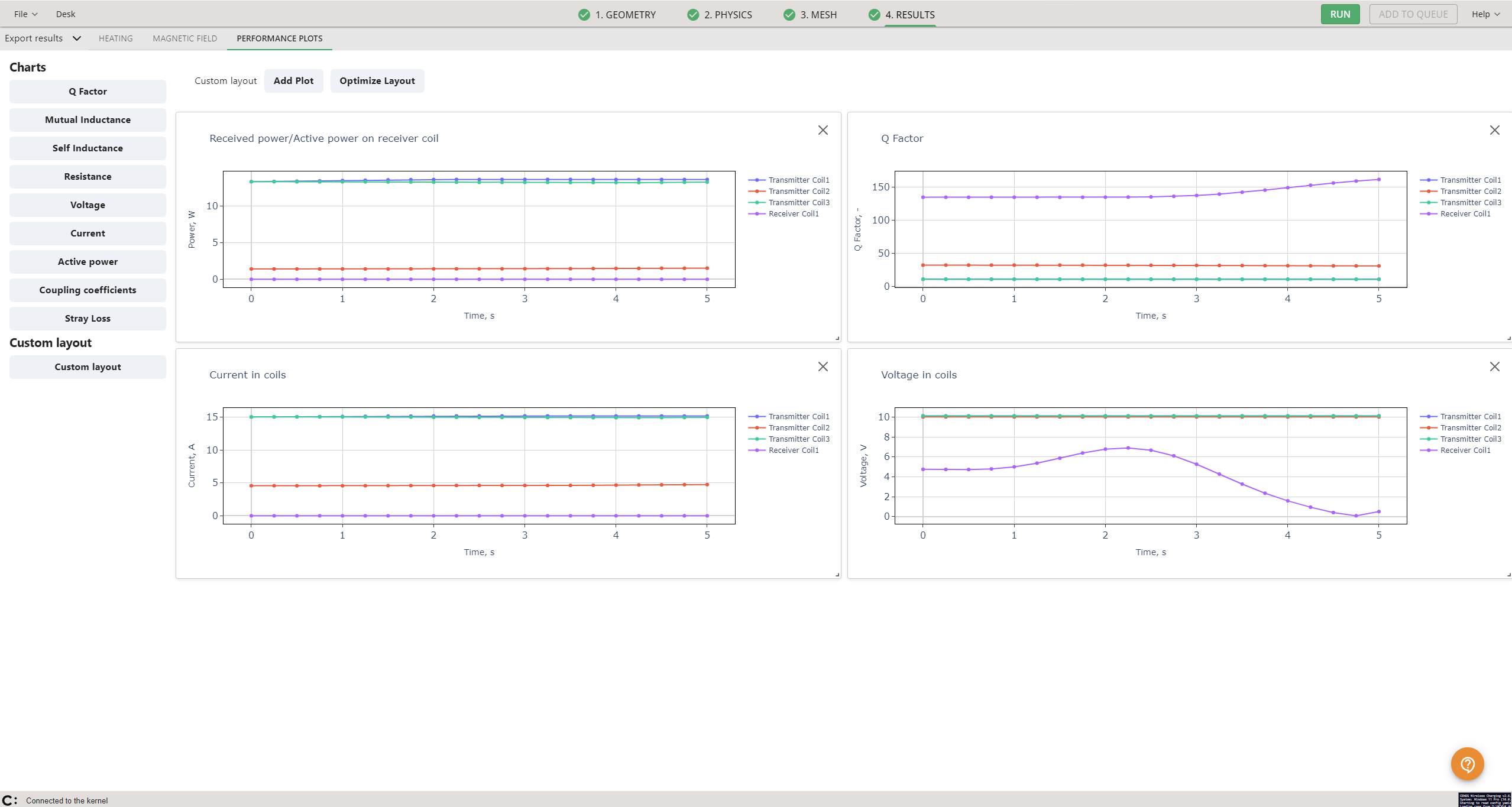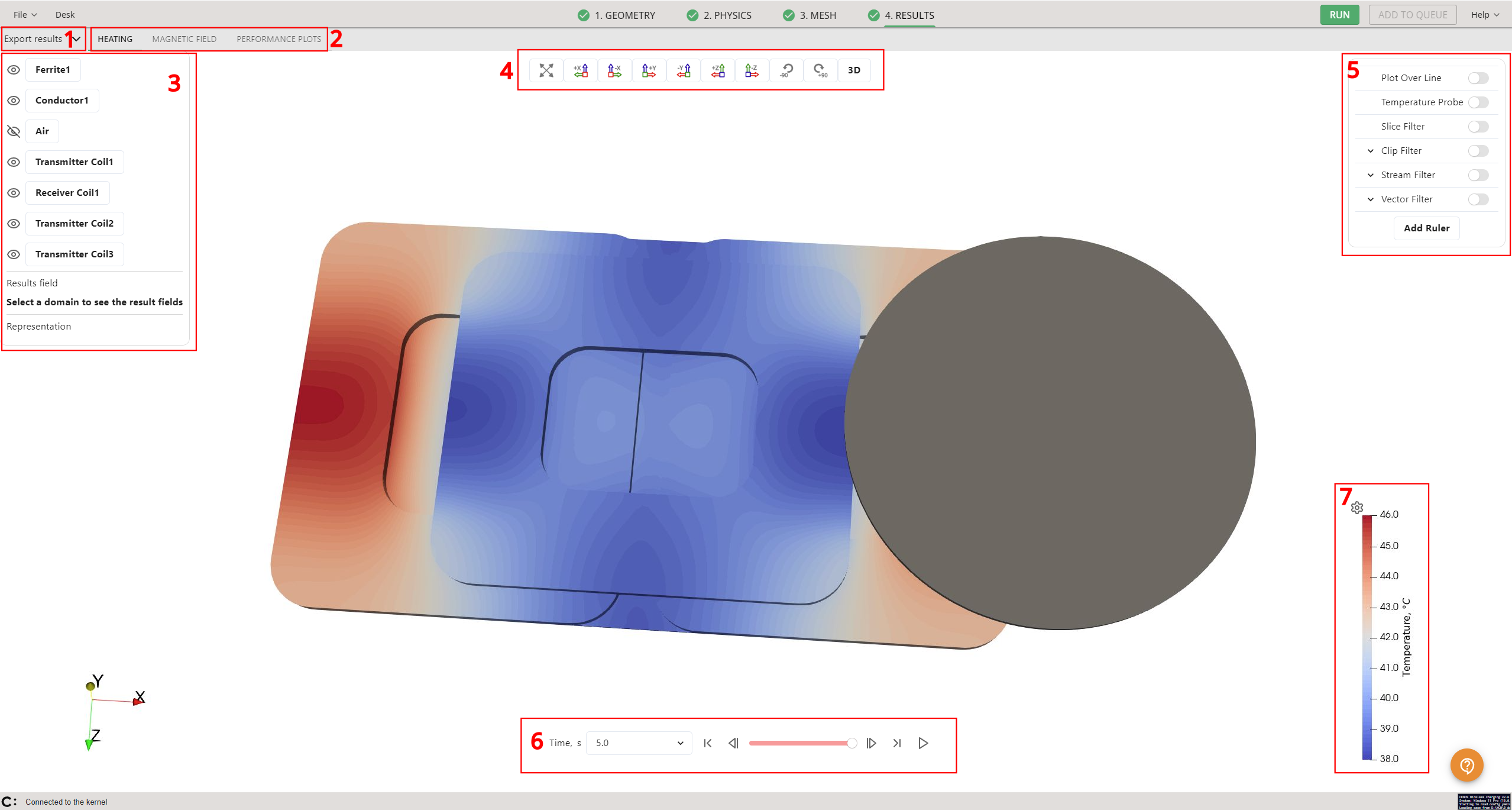 - Results tabs with different default filters enabled, for example, HEATING, MAGNETIC FIELD, PERFORMANCE PLOTS.