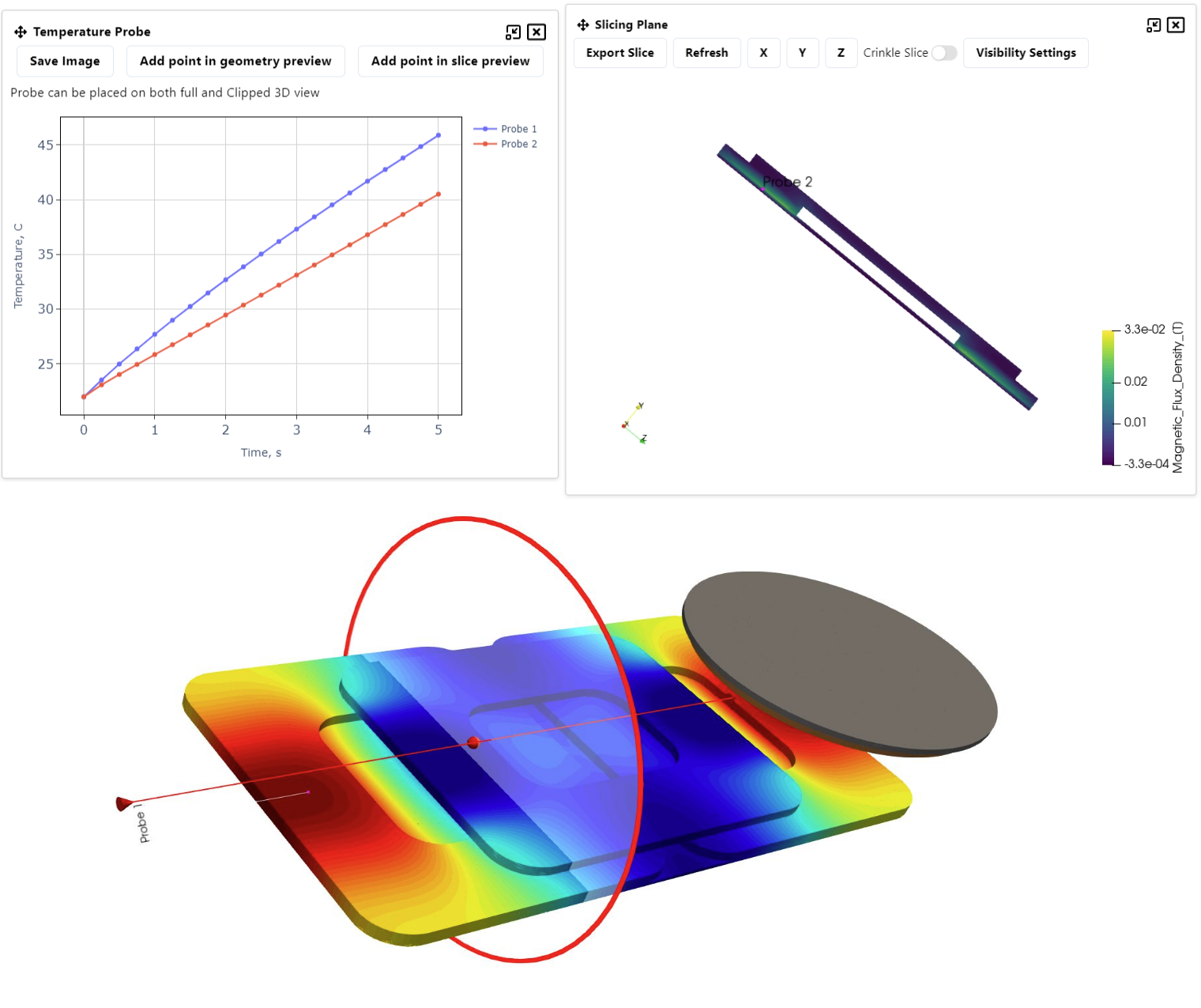 - In 3D, you need to click ‘Add point in geometry preview’ in the probe popup window and then select a point on the geometry. The selection will snap to the closest mesh crossing point or the closest mesh cell and then display the plot in the popup window.