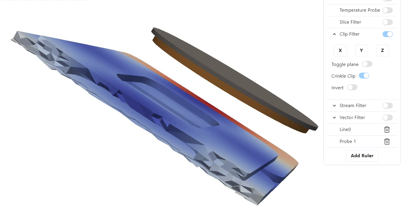 Similarily to plot over line – the created probes can be toggled visible or invisible by clicking on their names in the temperature probe popup window. They can be deleted by clicking the trash icon next to their name when they appear under all the filters on the right side.