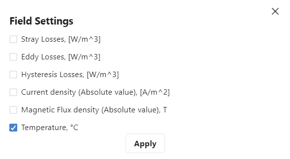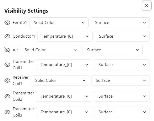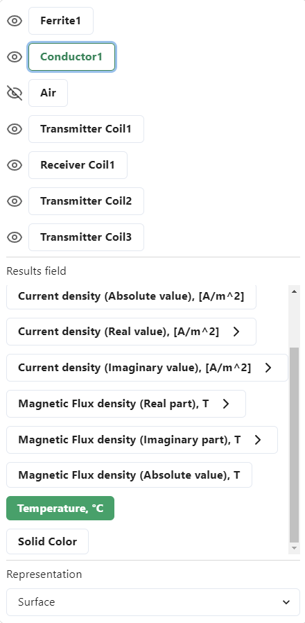 When you click on an object, you will see a more detailed menu show up – there you can choose how the object is displayed – what result fields it shows. It can be temperature, current density, Eddy losses, just solid color etc.